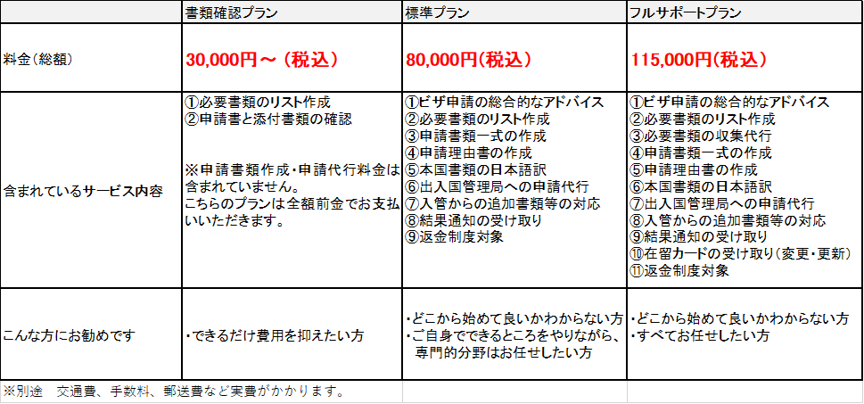 そこで、コンサルティングを最小限にして料金を抑えたい方プラン、専門家にすべて任せてスピーディーにビザ取得されたい方プランなどみなさまの状況に合わせた料金体系をご用意したしました。